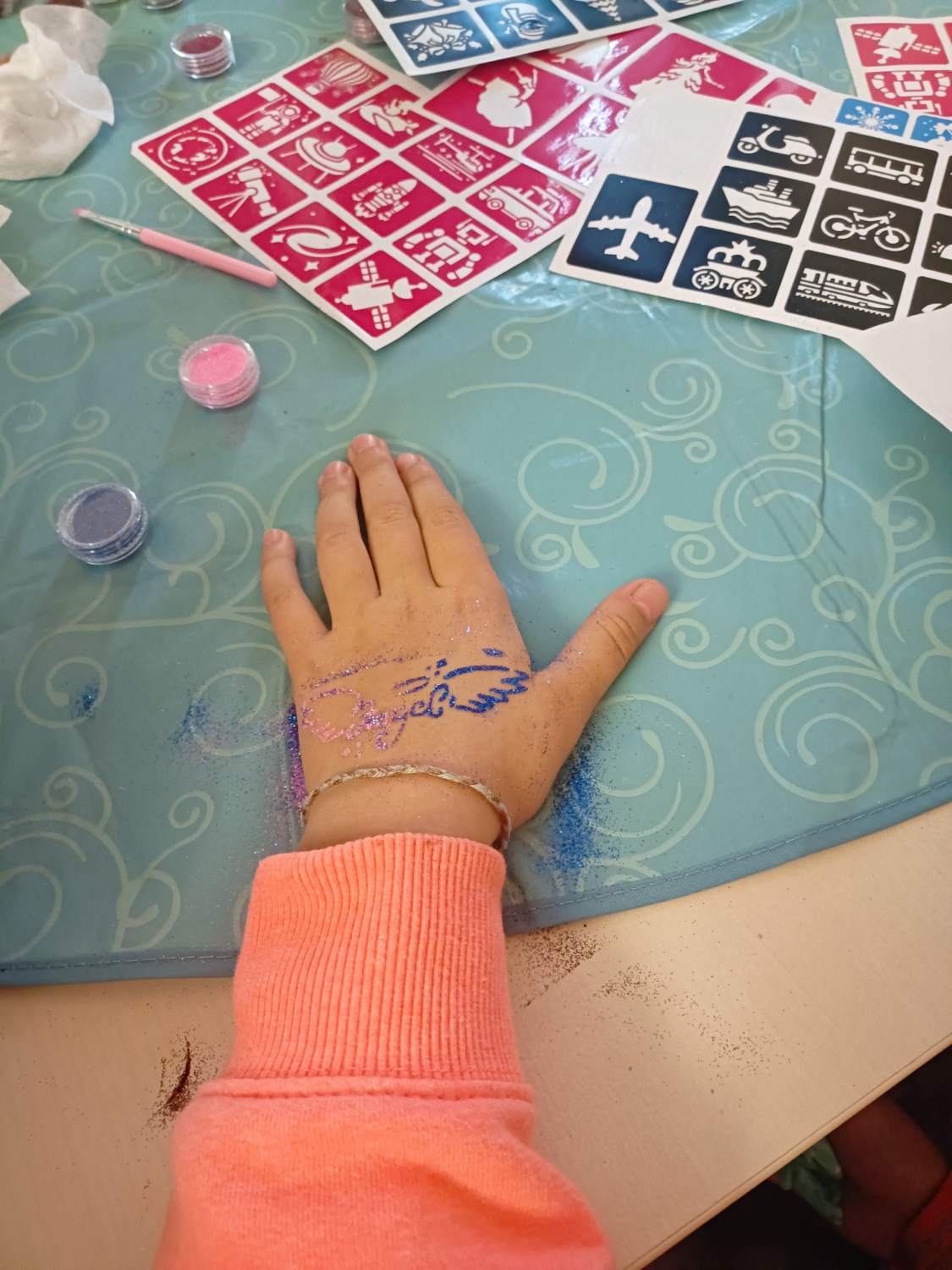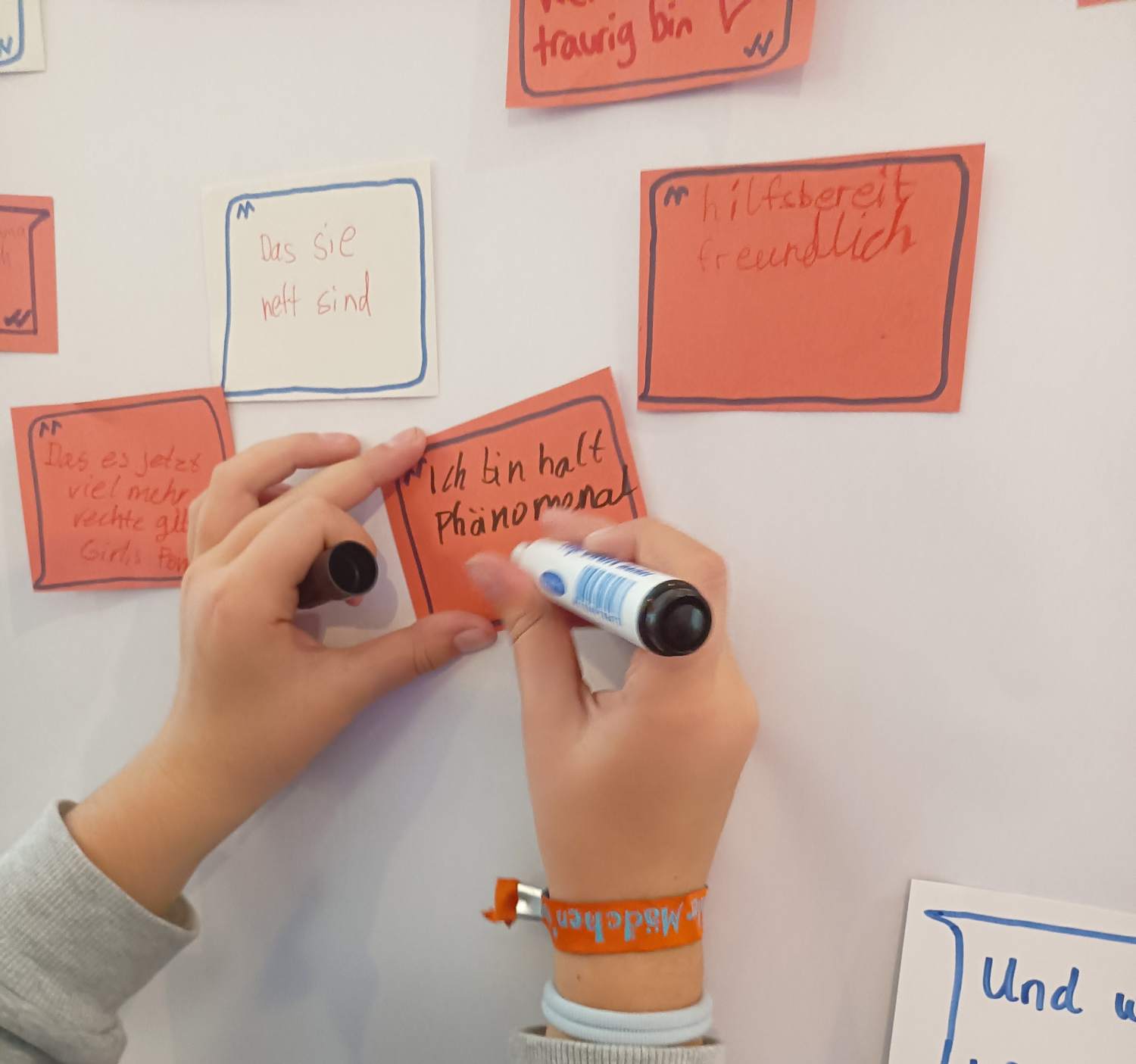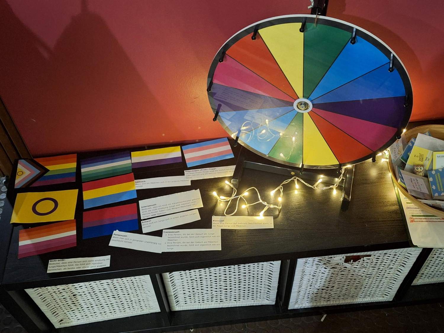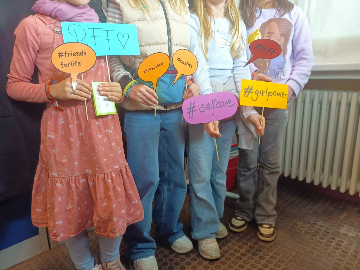 Sie hatten die Wahl zwischen Glitzertattoos und Freundschaftsbänder knüpfen, einer Fotostation für Fotos mit neu gewonnenen Freund*innen, einem Glücksrad mit Fragen zu den Rechten von Mädchen* und Frauen* oder im bunt geschmückten Discoraum tanzen. Ebenfalls gab es eine Themenwand, an der alle Mädchen* die Möglichkeit hatten, sich intensiver auszutauschen und verschiedenen Fragen zu beantworten, z.B. „Was mag ich an anderen Mädchen* und Frauen*?“ Für Verpflegung mit leckeren Backwaren und Getränken war natürlich ebenfalls gesorgt.
